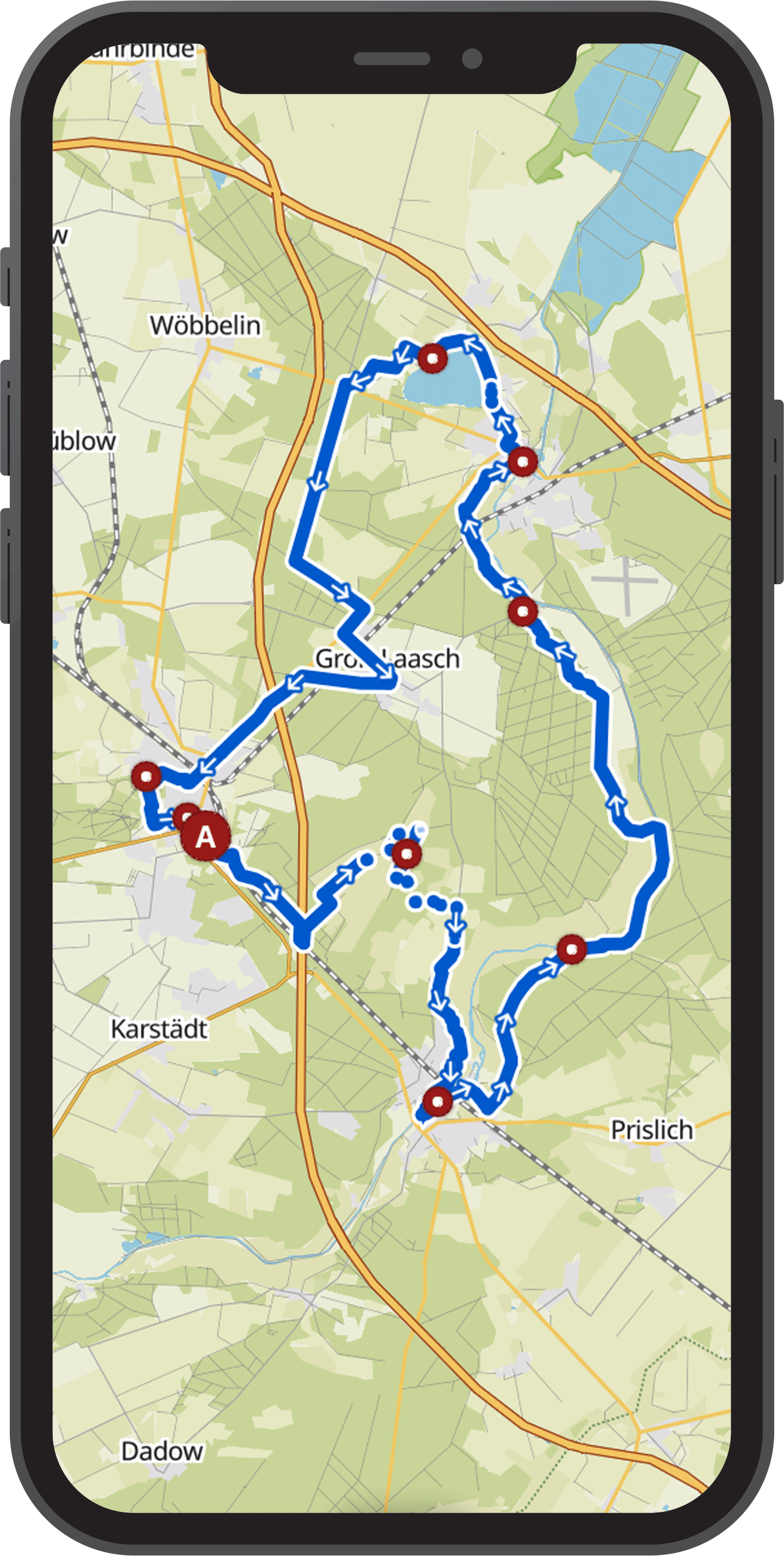 Die gesamte Strecke wird komplett ausgeschildert sein (gelbe Pfeile auf den Boden, gelbe Aufkleber mit Richtungspfeilen an Laternen und/oder gelbe Bändchen in stark naturbelassenen Abschnitten) sodass Ihr kein digitales Kartenmaterial benötigt. Wer trotzdem den genauen Streckenverlauf haben möchte (auch als GPX), kann ihn hier einsehen:
