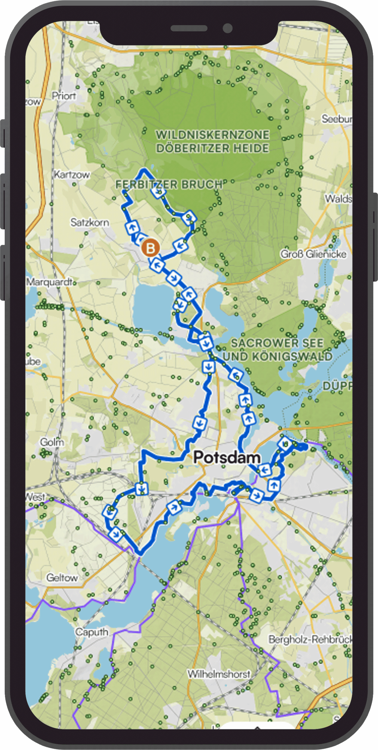 Die gesamte Strecke wird komplett ausgeschildert sein (gelbe Pfeile auf den Boden, gelbe Aufkleber mit Richtungspfeilen an Laternen und/oder gelbe Bändchen in stark naturbelassenen Abschnitten) sodass Ihr kein digitales Kartenmaterial benötigt. Wer trotzdem den genauen Streckenverlauf haben möchte (auch als GPX), kann ihn hier einsehen: